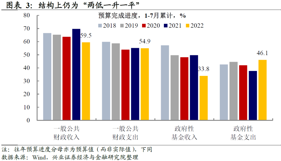 结构上看,仍为收入进度两低、支出进度一升一平。1-7月一般公共财政收入进度59.5%,政府性基金收入进度33.8%,较往年同期收入节奏均明显偏低,其中前者指向留抵退税的积极财政,后置指向土地出让金的拖累;同期,一般公共财政支出完成预算额的54.9%,基本持平疫后季节性,政府性基金支出完成预算额的46.1%,在专项债支出的拉动下持续高于季节性。