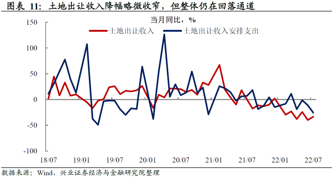 留抵退税拖累进一步减小,税收收入降幅持续收窄。7月,一般公共财政收入同比-4.1%,前值-10.6%,降幅收窄6.5个百分点,其中税收收入的拖累收窄9.5个百分点,非税收入的拉动下降3.1个百分点。具体而言,税收收入同比-8.3%(前值-21.2%),降幅收窄12.9个百分点,主因增值税的拖累收窄13.7个百分点,7月留抵退税1382亿元,较上月减少1866亿元,贡献了增值税1970亿元环比增幅的94.7%;此外,土地房地产相关税同比-17.2%(前值-4.5%),降幅重回两位数,这与房地产销售6月脉冲式回升之后7月重回季节性低位有关;消费税同比也自6.2%回落至3.3%,与7月疫情扰动之下消费增速回落互相印证。