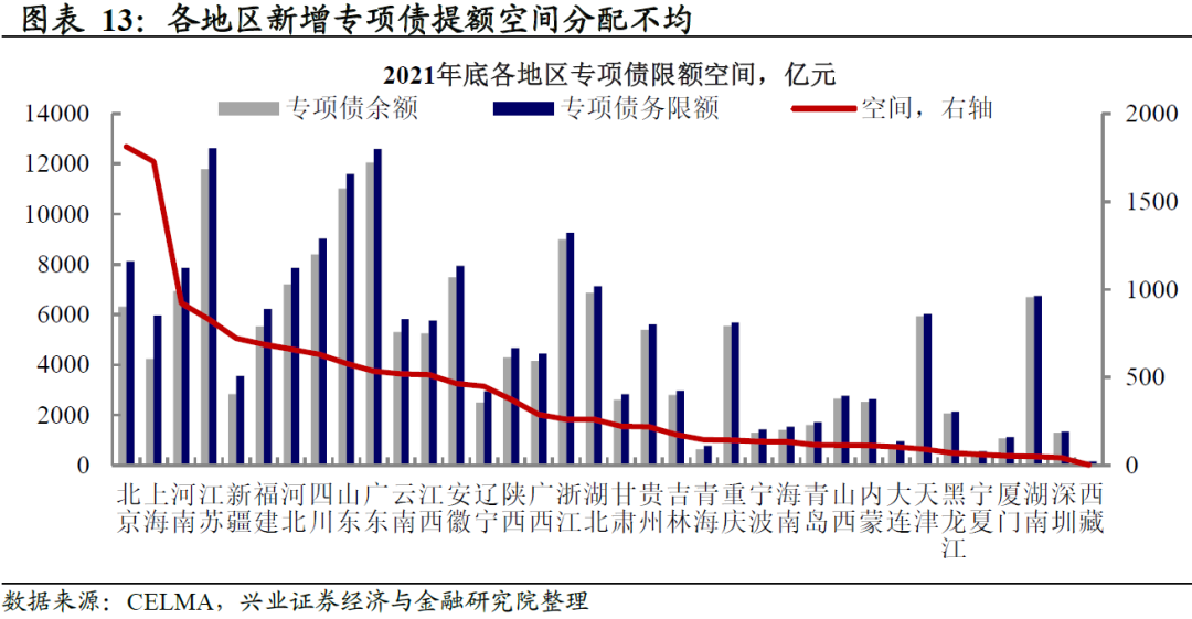 四季度动用专项债限额空间存在一定可能。7月28日政治局会议提出“支持地方政府用足用好专项债务限额”,8月16日总理在经济大省座谈会上表示“当前地方专项债余额尚未达到债务限额,要依法盘活债务限额空间”,且8月16日发改委相关负责人表示2022年第三批专项债券项目已形成清单[1],考虑到2022年新增专项债已发行94.8%,剩余额度仅1900亿元左右,如果限额空间对应债券可用于基建,或可匹配第三批项目。但限额空间省间分配不均的问题较为明显,调剂难度可能较大。
