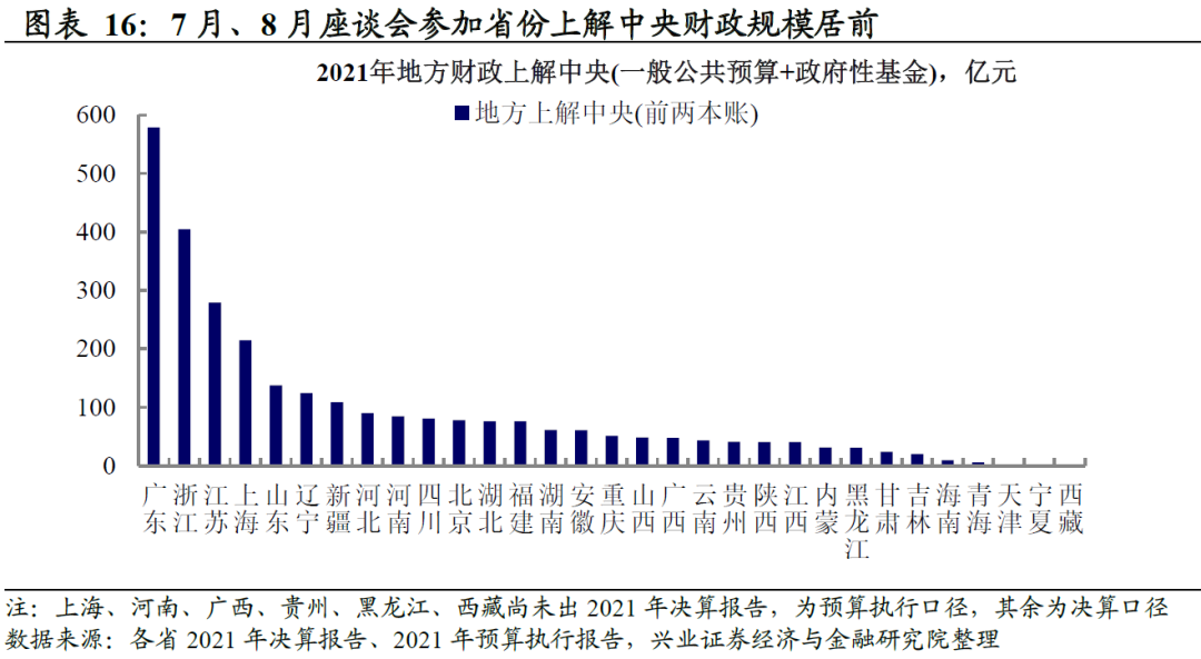 地方稳财源压力也较大,财政政策或需加快落地。总理在7月7日沿海五省座谈会上表示五省“在地方对中央财政净上缴中贡献近8成”,要求五省“稳增长稳财源”;在8月16日经济大省座谈会上要求“要完成财政上缴任务”,且表示“中央财政对地方转移支付已基本下达”,意即年内接下来几个月需要靠地方自己努力。但今年经济大省也明显受到疫情冲击,对比年初增速目标和上半年实际GDP增速,政治局会议之后,8省当中仅3省明确表态要完成全年目标任务,且近期浙江义乌出现疫情,或将扰动出口;四川高温限电限产保民用,生产生活秩序或也将受到一定影响,整体来看稳财源压力仍然较大,呼唤财政政策加速落地。这也契合政治局会议所要求的“财政货币政策要有效弥补社会需求不足”,货币政策已在长短端同时超预期降息10BP,前期布置的财政政策或也将进一步显效。