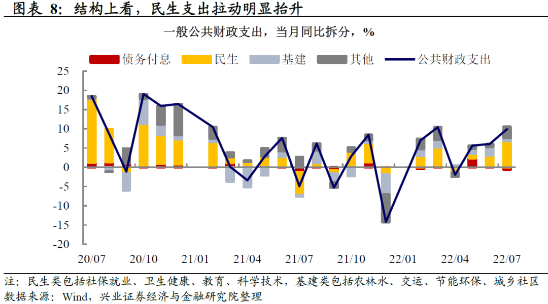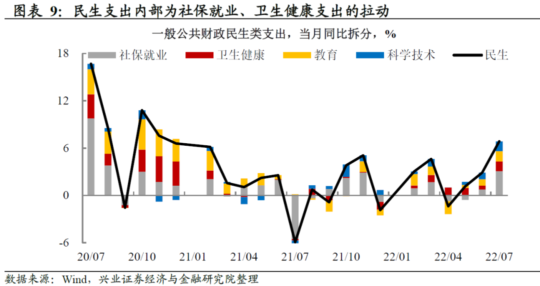 公共财政支出同比继续上行,主要为民生支出拉动。7月全国一般公共财政支出同比增长9.9%,债务付息同比转负;民生类支出拉动6.9个百分点(前值2.9个百分点),一方面是结构性就业压力之下毕业季财政加力稳就业,另一方面是疫情多地散发之下卫生健康支出增加;基建类支出拉动0.8个百分点(前值2.3个百分点)。