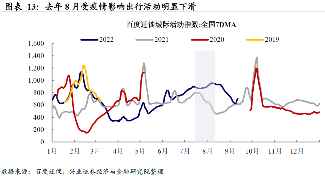 消费的反弹更多来源于低基数效应和季节性上行。8月社会消费品零售同比相较上月有所上行,其中餐饮消费同比实现转正,但这其中更多来自于去年疫情冲击消费带来的低基数效应。从环比季节性来看,餐饮消费和商品消费的环比相较于7月也有一定回升,但更多是季节性的上行,整体来看消费环比虽然好于2021年的水平,但仍然弱于2017-2020年的同期。这与我们在《宏观&交运大数据周报》中跟踪的百度迁徙数据相吻合,去年8月受疫情影响,城际出行活动指数出现明显下行,而今年8月整体出行水平相较去年有明显抬升,但8月底后受疫情扰动影响,城际出行水平再次下滑至2021年同期附近。