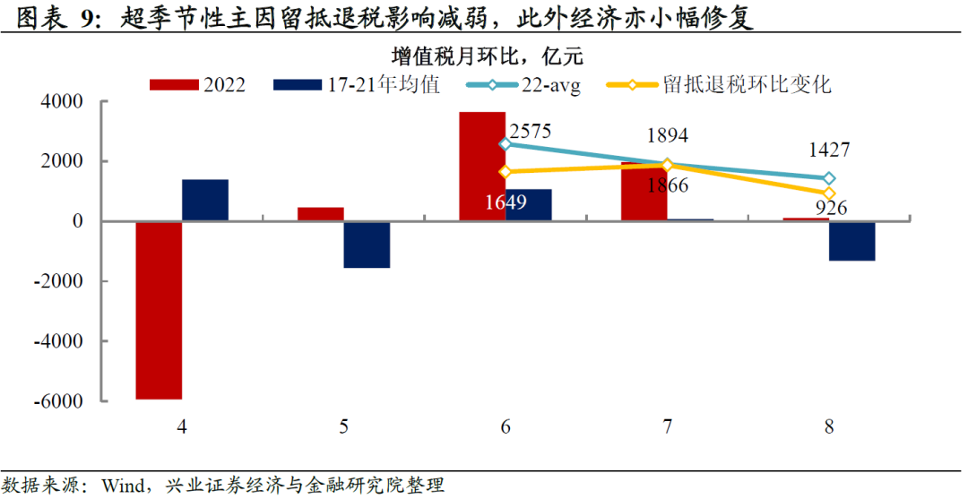 增值税改善有留抵退税与经济环比修复两方面原因。8月增值税环比虽然仅小幅增加106亿元,但大幅超出季节性1427亿元(近5年同期均值为环比下降1321亿元),其中8月留抵退税环比少退926亿元(7月留抵退税1382亿元,8月留抵退税456亿元),其余约500亿元或可由经济修复来解释,而7月基本都由留抵退税解释,相较之下显示8月经济环比小幅修复。