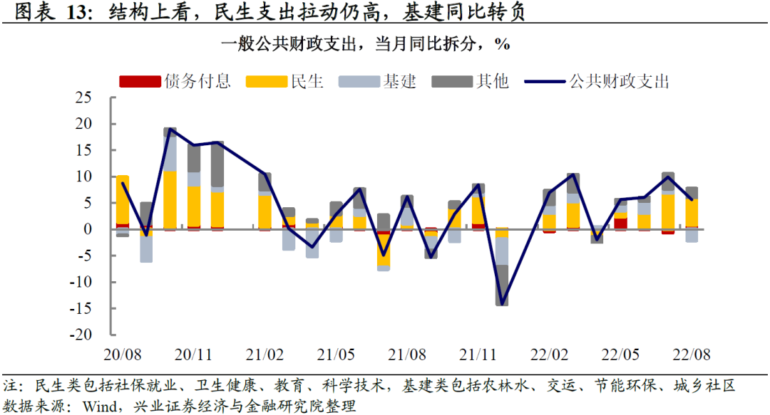 支出端:仍重在保民生,基建支出同比转负。社保就业支出仍占大头,考虑到8月青年失业率虽季节性回落但仍高,社保就业支出或仍将维持高增。