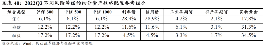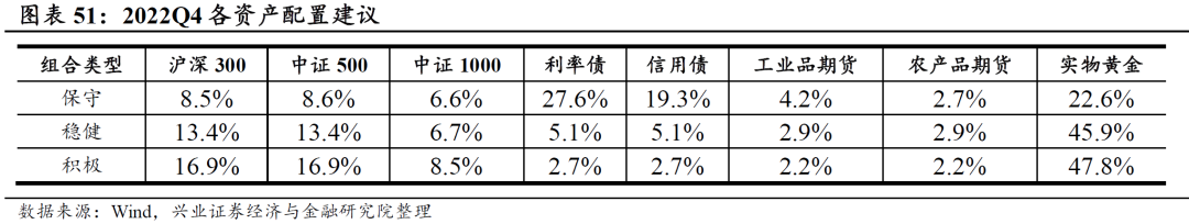 下表中展示了最新针对2022Q4保守、稳健和积极组合的资产配置建议结果。从战术配置结果来看,相对战略参考组合,模型超配了大盘股、中盘股、农产品、黄金,低配了信用债。