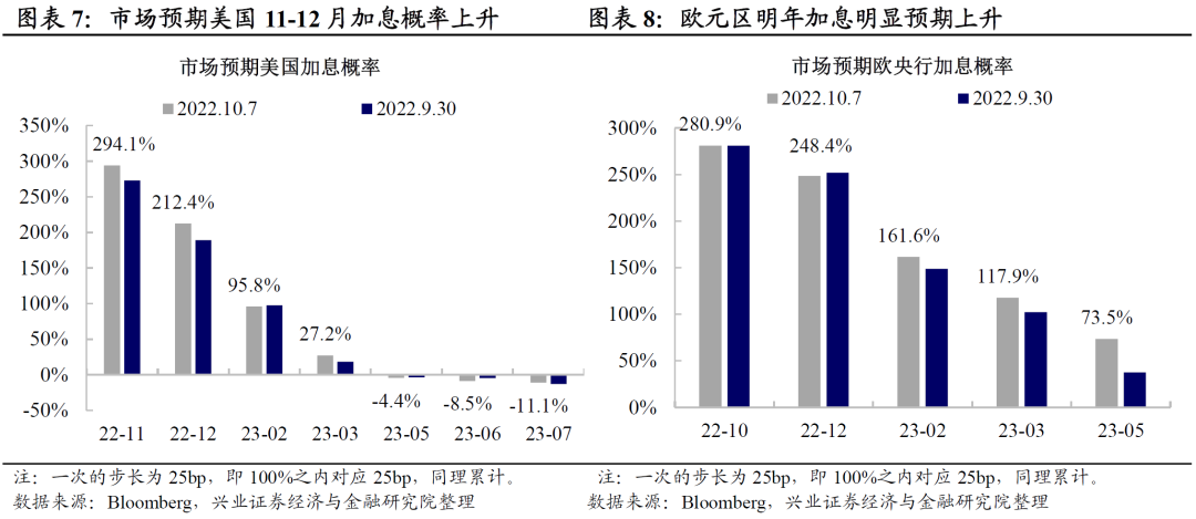 劳动力短缺意味着对抗通胀需要更大的牺牲,年内加息难停。当前劳动力就业市场的供需不匹配使得美欧皆呈现菲利普斯曲线的陡峭化,即失业率的下降对应着更大的通胀。叠加美欧央行加息本已滞后于本轮通胀周期,此时美欧央行需要实行更强硬的紧缩政策才能控制通胀。而无论是美联储还是欧央行都多次表示经济放缓不会阻碍其加息决心。9月美国非农数据发布后,11-12月联储仍然加息的概率显著上升,而9月CPI通胀历史首次站上10%之后,市场对于欧央行明年进一步加息的预期也有所抬升。整体而言,在就业市场制约核心通胀缓解的背景下,年内美欧央行大概率将继续保持鹰派的加息节奏,而这对本身就已处于下行趋势的美欧经济造成更大的压力。