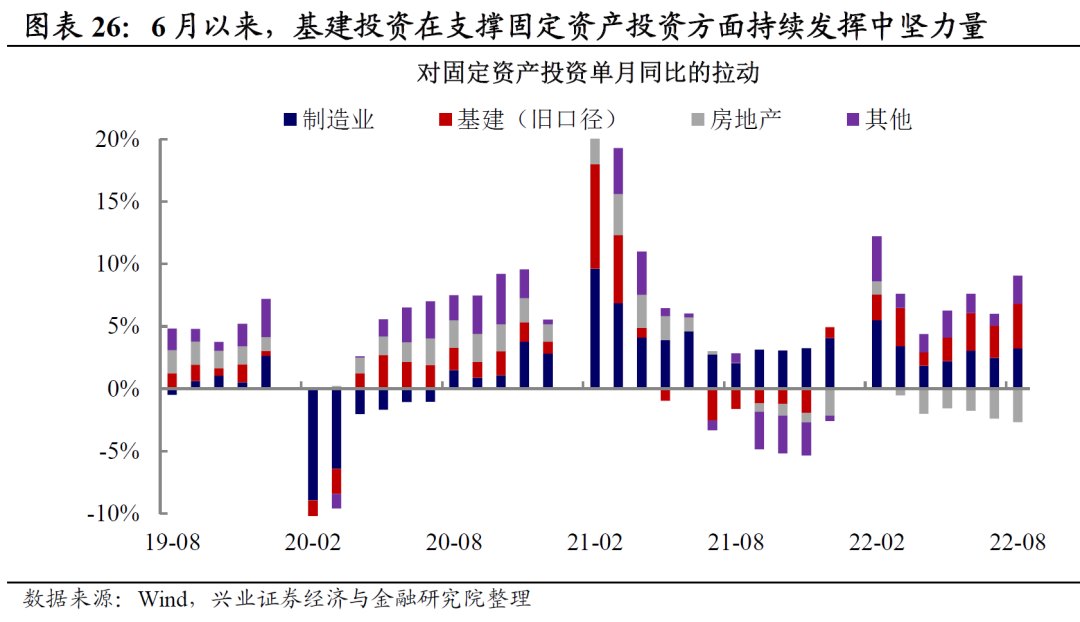 在稳增长政策带动下,基建保持较强、中观回暖,生产端出现明显改善。在稳增长政策不断发力的牵引带动下,自6月以来,基建投资在支撑固定资产投资方面一直发挥着中坚力量,8月基建投资同比增长15.31%,约拉动固定资产投资上涨3.59个百分点,持续保持拉动固定资产投资主要力量作用。除基建投资之外,政策支持的高新技术行业,如电气机械及器材制造、汽车、计算机通信和其他电子制造业投资也增长迅速。从中观高频指标来看,年中以来螺纹钢和石油沥青装置开工率等高频数据持续回升,也反映生产动能在逐渐回暖。
