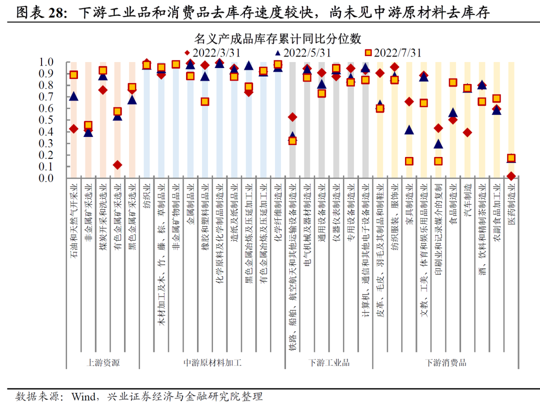 后续生产改善延续性主要看接续政策继续落地及库存周期演变形势。从政策方面看,2022年9月以来接续政策中3000亿元政策性开发性金融工具已经于9月下旬完成投放落地;而5000多亿元专项债地方结存限额的使用目前较多省份已经完成前期准备工作,国常会也明确部署要求10月份发行完毕,加之9月底国务院稳经济大盘四季度工作推进会议也明确部署明年的专项债前置发行工作,后续四季度政策在落地层面仍有牵引动能。从库存方面看,当前,下游工业品和消费品去库存速度较快,但尚未见中游原材料去库存,后续中游库存的演变动态,将是影响生产改善动能的关键。