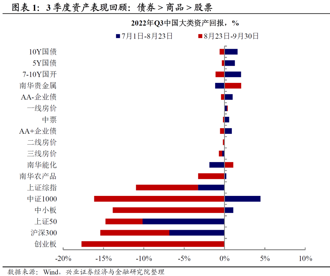 我们在上一篇大类资产报告《寻找资本市场的“避风港”》中强调,二季度国内市场开始交易疫后复苏反弹,无论从流动性还是经济基本面而言,中国相较海外皆是“避风港”。但是,随着经济疫后反弹填坑逐步完成,三季度经济再次回归原先下行中枢,叠加海外加息节奏超预期+地缘政治事件冲突不断使得风险资产承压,全球风险资产的Risk-off是三季度市场的主线。