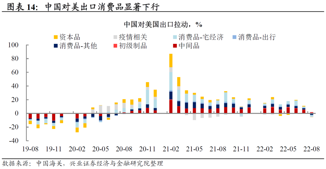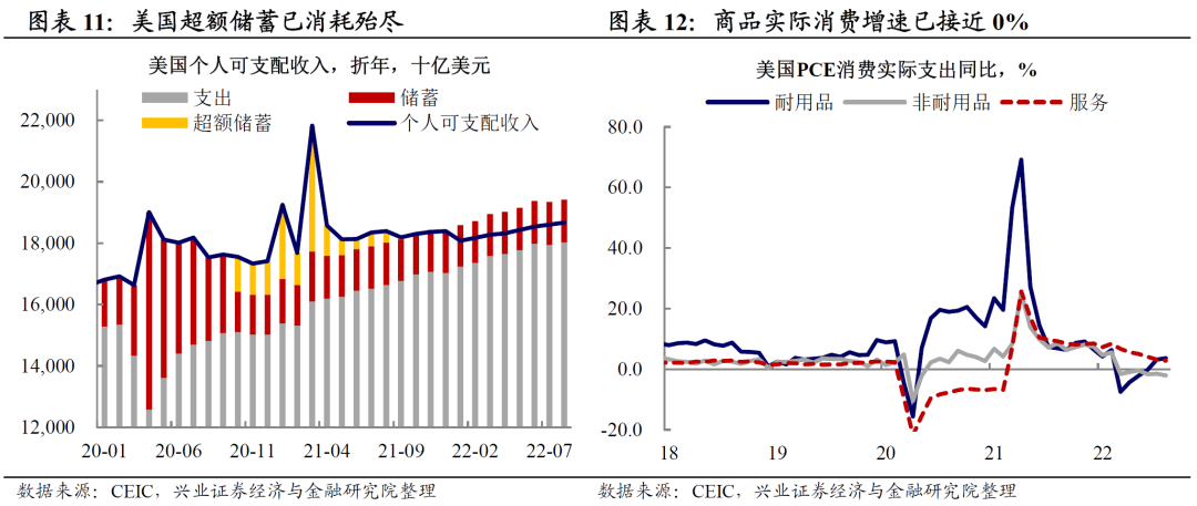 美国:超额储蓄消耗殆尽,商品消费逆风凸显。受美国本轮大规模财政刺激的影响,美国商品消费自2021年下半年以来呈现明显的“肥尾”特征(即消费回落的斜率较为平缓)。但是,居民超额储蓄已消耗完毕,而7月以来美国居民个人可支配收入和商品消费增速也都走平。随着美国商品消费的走弱,美国厂商也逐渐由主动补库存转为去库存,2022年2季度美国实际库存变化已转负,尤其零售商去库存更加明显。在这一背景下,中国对美国出口消费品自今年3季度以来也明显下滑,尤其前期受美国地产行业拉动的宅经济相关消费品下滑最为明显。
