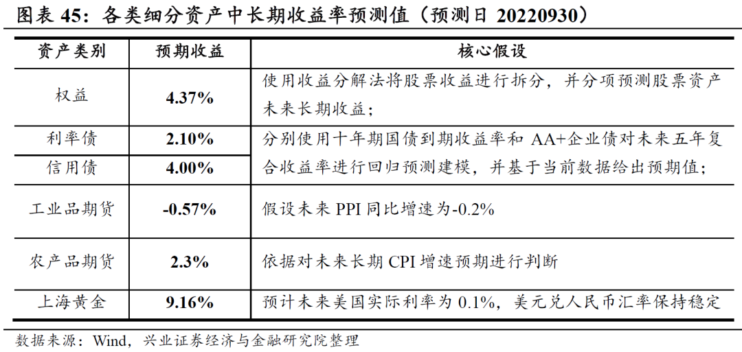 由于篇幅限制,我们将不逐一介绍各大类资产长期收益的建模过程,下表展示了我们对各细分资产未来五年的年化符合收益预测结果,以及预测过程中使用的核心假设情况。