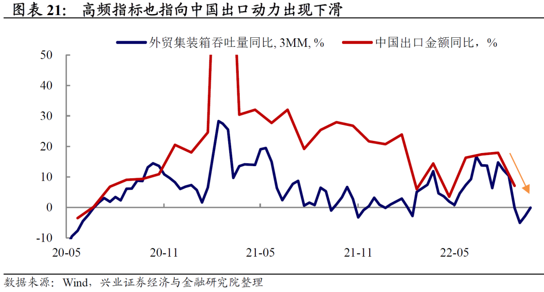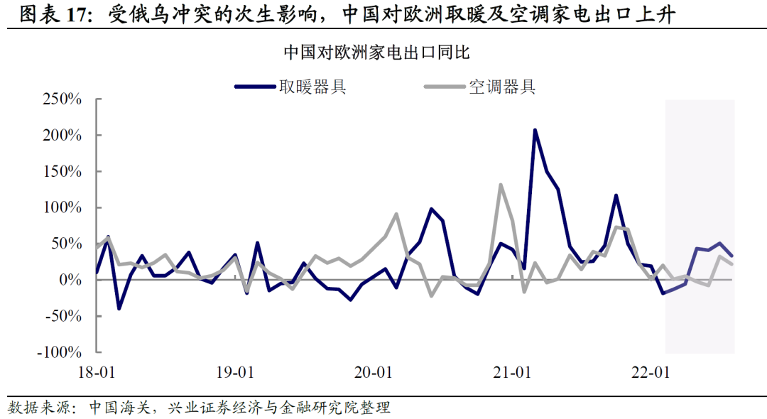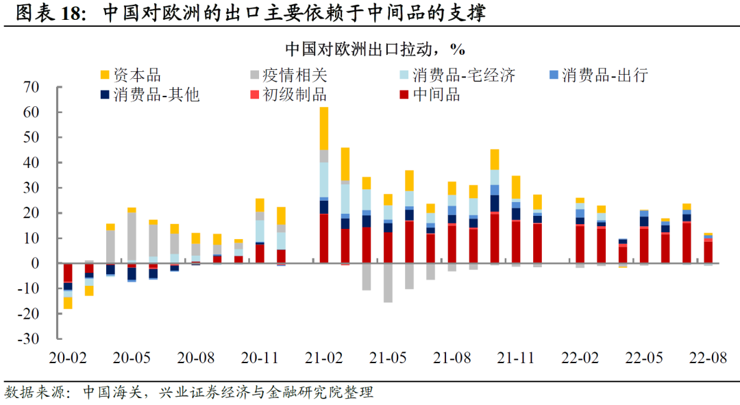 但是,值得注意的是,欧洲的半耐用品消费(纺服、家具、家用电器等)仍然相对强劲。这一方面或来自于前期购房后的装修需求,另一方面也源于俄乌冲突之后,由于能源价格高涨带来的对热泵空调和电热毯等取暖设备的需求。自2022年3月以来,中国对欧洲出口的取暖和空调设备一直维持着较高的增速,但近期增速有所下滑。我们在《20220810-寻找中国出口产品的Alpha-兴证宏观·全球价值链系列三》曾提及,俄乌冲突后,欧洲能源危机使得其生产能力受到重创,从而不得不对外进口更多的化工品和中间品,这也使得中国对欧洲的出口在俄乌之后保持强劲。这意味着在整体欧洲需求疲弱,中国对欧洲出口Beta下行的同时,仍然有部分商品的出口有一定的Alpha的机会,但这不足以改变整体的出口下行趋势。