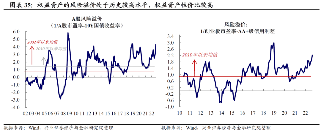 从估值来看,权益市场的性价比优势明显显现。从股债之间的比价来看,当前上证综指相较10年期国债收益率的风险溢价处于历史高位水平;而创业板相对于信用债的风险溢价也继续上升至历史高位,这意味着权益资产的相对估值优势显现。