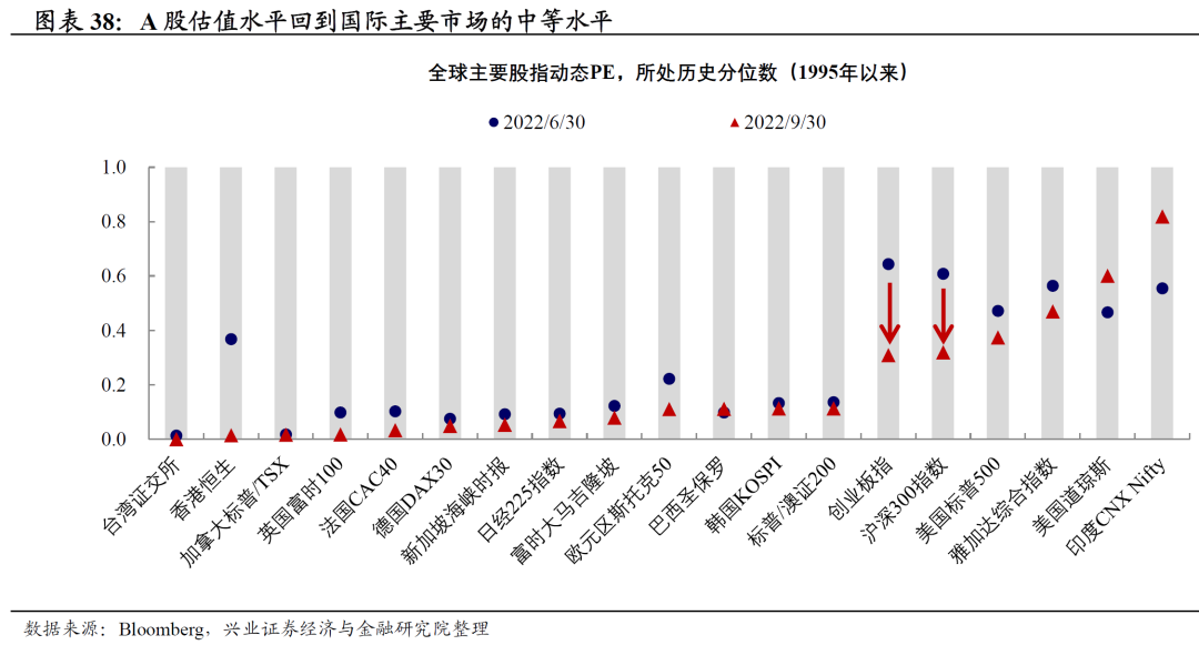 A股估值水平回到全球中等水平。4月底时,相较于全球股票市场,A股市场估值处在相对低位。但5月以来,A股市场与海外市场走势分化,海外市场受发达经济体货币政策转向的影响,出现明显回撤,但A股市场一方面由于前期估值不高,另一方面我国宏观政策“以我为主”,受海外发达经济体政策影响较小,A股市场出现反弹。到6月底,A股市场估值已是全球估值较高的市场之一,在全球的估值“洼地效应”有所减弱。而经过了三季度的调整之后,当前A股市场估值回到自身历史分位数较低水平,但与全球主要市场相比,仍然处于中等偏高水平,较美国、印度市场更便宜,但较欧日市场相对较贵。