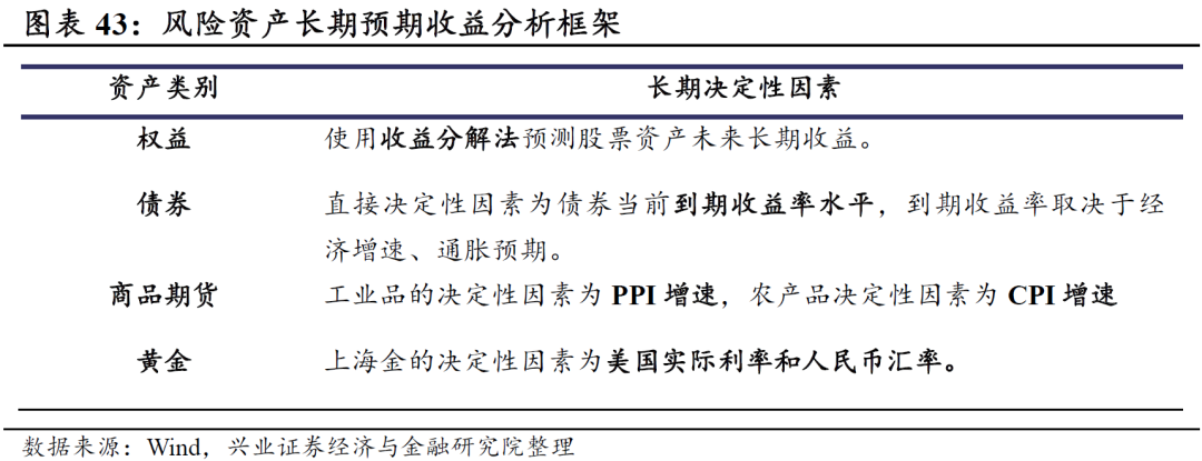 下表给出了不同大类资产长期预期收益的分析逻辑框架,包括影响大类资产长期收益的决定性因素,以及相应的动态调整项目。我们基于历史数据将决定性因素和资产滚动收益率进行分解或回归建模,并基于当前环境下的宏观状态预判,给出各资产长期收益的估计。