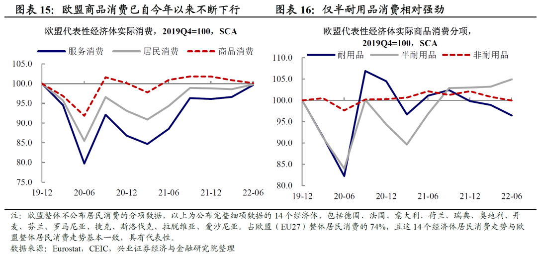 欧洲:需求明显承压,但在供给冲击下对部分商品进口需求上升。我们在《20220930-为何“躺平”难救欧洲经济》中曾提到,疫后欧洲经济的复苏主要依赖于财政扩张和房地产部门的支撑,而这两项的前提都是宽松的货币政策。但是正如前文所述,俄乌冲突后带来的高通胀使得欧央行不得不被迫转鹰,这使得欧洲的两大经济支柱皆受到阻碍。自2022年以来,欧盟实际商品消费明显走弱,耐用品和非耐用品消费已经弱于2019年4季度的水平。