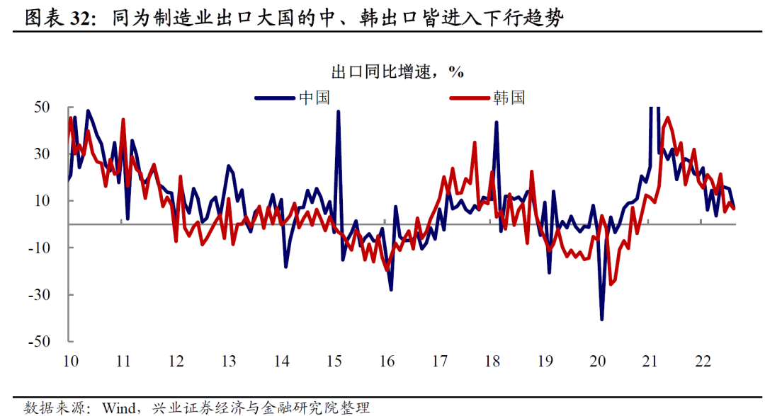 疫情以来的外需支撑形势后续将面临变化。疫情以来,在海外政策强刺激下需求出现扩张,而我国因为科学有序的疫情防控、完备稳健的生产供应体系在全球供给优势凸显背景下,我国出口持续保持较好增长趋势,经济受外需支撑明显。今年以来,海外形势发生剧烈变化,美联储快节奏加息、俄乌冲突升级、欧洲能源危机叠加,给全球需求盖上了深深的阴霾;大宗商品涨价趋势的趋缓,出口受涨价因素支撑出现下降;大国博弈加剧、能源领域竞争凸显,发达经济体频频使用制裁工具,全球贸易壁垒加大;受这些因素叠加影响,同为制造业出口大国的中、韩,出口增速自2021年下半年以来皆进入下行趋势。往后看,以上诸多因素还会继续演绎,我国出口下行趋势较为确定,疫情以来的外需支撑形势面临变化。