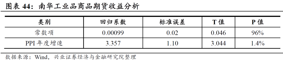 对于债券、工业品期货以及我们也尝试使用回归模型对资产收益变化进行解释和预测,以工业品商品期货为例,我们将PPI年度同比增速作为解释变量,对工业品商品期货的当年收益进行回归分析,可以看到解释变量的T值超过3,回归模型R2达到50%,因此我们可以结合对未来中长期PPI增速预判给出预期收益值。