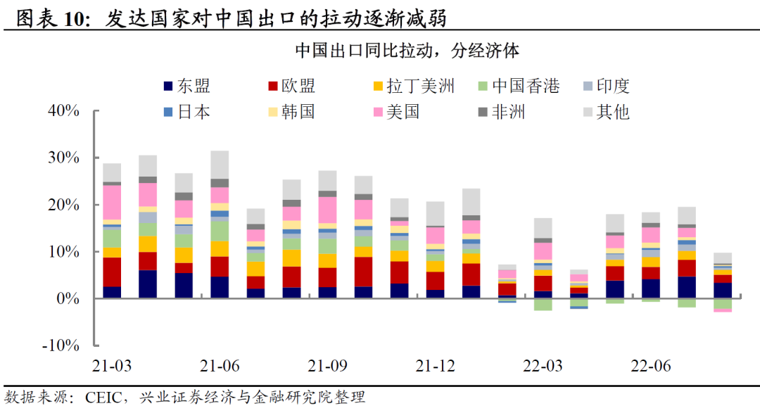 外需是2022年2季度的主要拉动,但该动力逐步消退。二季度以来,受疫情反复和防控措施的影响,内需受到较大冲击,生产和消费皆表现疲弱,外需成为中国经济的主要拉动。其中,美国、东盟和欧盟是中国出口主要的三个经济体。但是,3季度末以来中国出口动力逐渐减弱。虽然东盟对中国的出口支撑仍然保持韧性,但前期支撑中国出口高增的发达经济体(尤其是美国)的商品消费在加息的阴霾下已到了强弩之末,美国对中国的出口拉动在8月甚至已转负。而由于欧洲能源短缺问题,中国在欧洲进口份额中有所抬升,这或使得中国对欧洲出口下行速度放缓,但难以改变下行趋势。