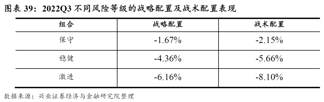 2022年三季度各资产收益率都表现一般,保守、稳健和积极战略配置组合的收益分别为-1.67%、-4.36%和-6.16%,保守、稳健和积极战术配置组合的收益分别为-2.15%、-5.66%和-8.10%。下图表回顾了2022年三季度策略的表现以及不同风险等级的细分资产配置参考组合。