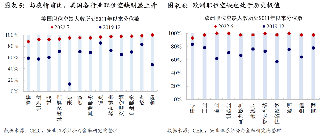 美欧劳动力供需错配带来核心通胀黏性。即使美欧自年中以来就已开启激进加息之路,需求端已明显走弱,而供应链的冲击也在逐渐缓解,但是美欧通胀仍然居高不下。其关键在于劳动力供不应求,导致核心通胀的黏性超预期。即使美欧经济已边际走弱,但是劳动力市场仍然缺人,职位空缺率仍位于历史高位。这一部分源于前期财政发钱使得低端劳动力不愿意回归劳动力市场,另一部分也则是因为“Long Covid”后遗症或使得部分劳动力就业意愿大幅下滑,甚至退出劳动力市场。(详见《20220929-“躺平”后的海外劳动力损失——疫后海外那些事儿之二》)