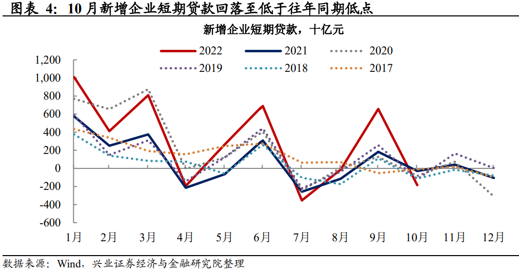 居民端:中长期贷款下滑拖累新增贷款大幅走低,融资需求加剧走弱。10月,居民短期贷款、长期贷款双双走弱,其中,中长期贷款拖累更甚。短贷下滑可能受疫情反复影响,房地产销售在十一假期后再度回落至较低水平,购房需求走弱对居民中长贷拖累加剧。