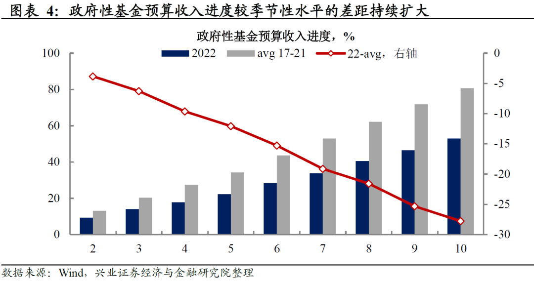 支出端:同比降幅收窄。10月,专项债结存限额集中发行,当月新增专项债发行4279亿元,带动政府性基金支出同比降幅收窄22.2个百分点;不过, 10月政府性基金支出仍处于季节性低位。