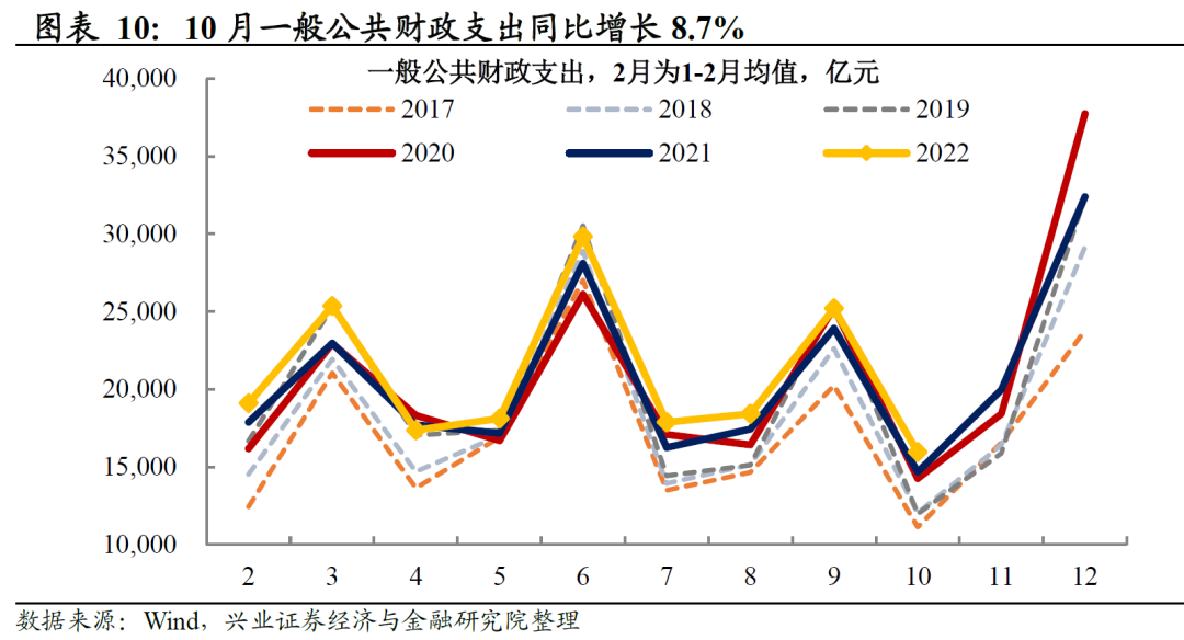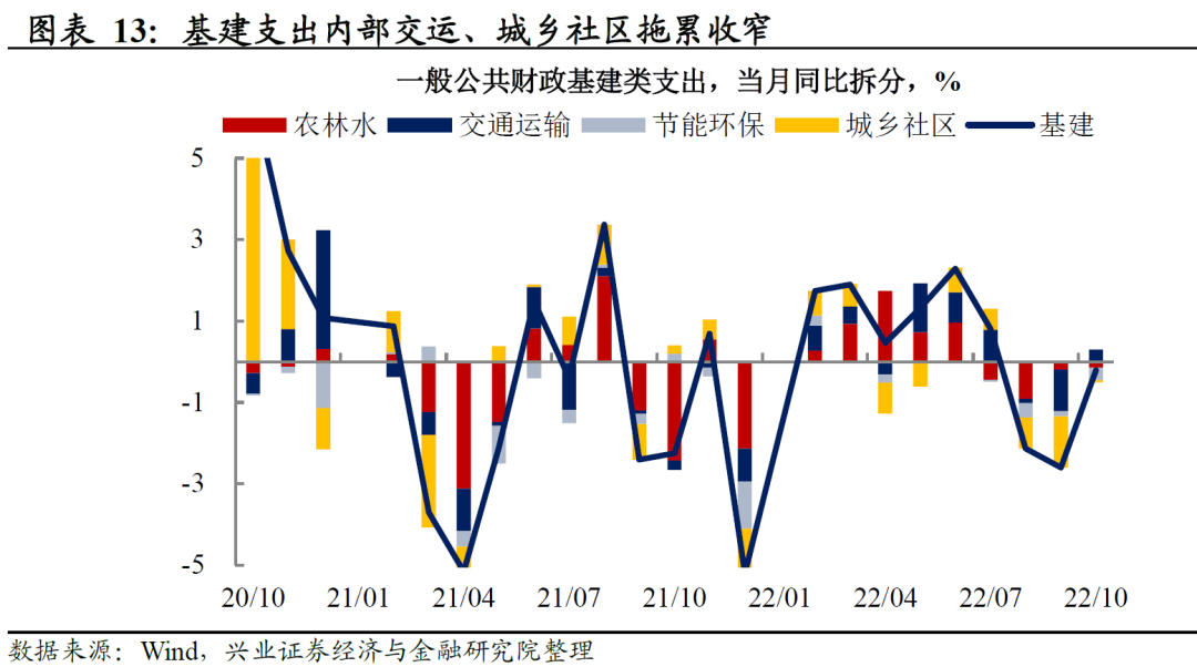 公共财政支出增速上行,基建支出拖累收窄。10月全国一般公共财政支出同比增长8.7%,较前值5.4%上行3.3个百分点,其中债务付息支出同比拉动1.2个百分点;民生类支出拉动4.2个百分点,抬升0.7个百分点;基建类支出拖累0.2个百分点,较上月收窄2.4个百分点。民生支出方面,卫生健康、社保就业支出仍高,背后或指向10月疫情形势加重、失业压力仍高(城镇调查失业率环比高于季节性,参见20221115《乍暖还寒 ——2022年10月经济数据点评》),仍需财政持续发力。基建支出内部,交运、城乡社区事务两项支出拖累明显收窄。