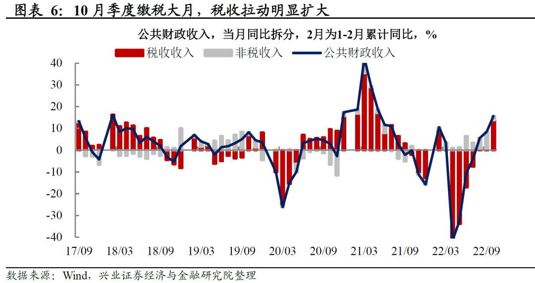 缴税大月,一般公共预算收入高增。10月,一般公共预算收入同比增长15.7%(前值8.4%),其中税收收入拉动13.8个百分点,较上月抬升13.5个百分点;非税收入拉动1.9个百分点,较上月下滑6.3个百分点。