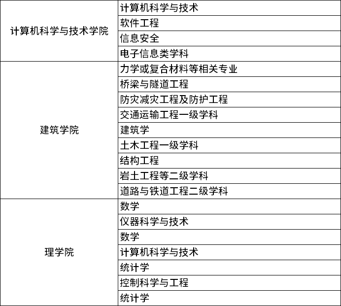 计算机科学与技术、软件工程、网络空间安全、数据科学与大数据技术,信息与通信工程、电子科学与技术、集成电路科学与工程、人工智能,控制科学与工程、电气工程、机械工程、仪器科学与技术、机械电子工程,交通运输工程、控制科学与工程、电气工程,环境科学与工程、土壤学、生态学,测绘科学与技术、地理信息科学、遥感科学与技术,数学、物理学,管理科学与工程、工商管理、应用经济学、物流管理与工程、会计学,法学、英语,马克思主义理论,艺术学、设计学,体育学