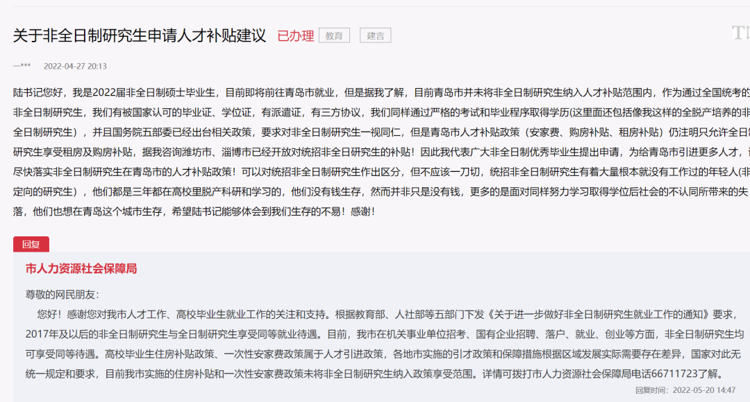 拿到这一决定书,刘浩哲依然难以认同。他认为,教育部的相关通知已经明确,自2017年起,全日制和非全日制研究生由国家统一下达招生计划,考试招生执行相同的政策和标准,培养质量坚持统一要求,学历学位证书具有同等法律地位和相同效力。刘浩哲认为石家庄市人民政府提出的“市人社局对政策的答复行为对当事人的权利义务不产生实际影响,不属于《中华人民共和国行政复议法》第六条规定的行政复议范围”的理由不能成立。刘浩哲决定对石家庄市人民政府提起行政诉讼。5月21日,刘浩哲将行政起诉状及其相关材料递交给了石家庄市中级人民法院。教育部《关于进一步做好非全日制研究生就业工作的通知》提到,各级公务员招录、事业单位及国有企业公开招聘要根据岗位需求合理制定招聘条件,对不同教育形式的研究生提供平等就业机会,不得设置与职位要求无关的报考资格条件。各地要合理制定人才落户条件,精简落户凭证,简化办理手续,为不同教育形式的研究生提供平等落户机会。近日,有地方对这一问题进行了回应。如青岛市人社局表示:“目前,我市在机关事业单位招考、国有企业招聘、落户、就业、创业等方面,非全日制研究生均可享受同等待遇”,但“高校毕业生住房补贴政策、一次性安家费政策属于人才引进政策,各地市实施的引才政策和保障措施根据区域发展实际需要存在差异,国家对此无统一规定和要求,目前我市实施的住房补贴和一次性安家费政策未将非全日制研究生纳入政策享受范围”。“人才引进及补贴政策是结合全市经济社会发展、人才队伍建设实际及用人单位需求而制定,具有差异化特征,有一定特殊性。因此,目前还未将非全日制研究生纳入人才政策范围,但我市仍在不断探索优化人才政策,例如今年新出台的高校毕业生就业安家补贴就是创新突破的体现。”从政府部门的角度来看,教育部相关通知已明确,自2017年起,全日制和非全日制研究生考试招生执行相同的政策和标准,理当享受同等待遇。但地方政府给出的说法是,人才引进及补贴政策是结合全市经济社会发展、人才队伍建设实际及用人单位需求而制定,具有差异化特征,有一定特殊性,因此,还未将非全日制研究生纳入人才政策范围。双方各执一词。网友舆论也是莫衷一是。支持者认为,当前非全日制研究生也要参加统考,非全和全录取分数线都是一样的,培养标准和毕业要求也一样,比以前在职研究生难多了,和以前的“非全”不一样,而且既享受不了助学金,还要完成课题组日常的工作任务,当一视同仁。反对者则认为,非全研究生一方面在学习学术方面没有全日制的付出多,自己有工作有收入,另一方面什么都要和全日制看齐,这才是真不公平。政策是一个引才政策,并不是一个普惠性质的就业政策,个人认为并不存在就业歧视。简单从政策角度讲讲这个事儿。先说说教育部的文件。教育部办公厅等五部门《关于进一步做好非全日制研究生就业工作的通知》中“二、强化就业权益保护 用人单位招用人员应当向劳动者提供平等就业机会。各级公务员招录、事业单位及国有企业公开招聘要根据岗位需求合理制定招聘条件,对不同教育形式的研究生提供平等就业机会,不得设置与职位要求无关的报考资格条件。各地要合理制定人才落户条件,精简落户凭证,简化办理手续,为不同教育形式的研究生提供平等落户机会”,这条政策是从维护非全日制研究生就业权益的角度出发要求各地在就业、落户等方面要提供平等机会。近几年,石家庄的市直事业单位招聘、河北省四级联考等招考没有再对研究生是否全日制进行限制,包括遴选等也都一视同仁,严格落实了《关于进一步做好非全日制研究生就业工作的通知》文件中对就业权益保护的有关要求。今年2月22日,石家庄市人民政府办公室印发了《关于进一步吸引留住人才的若干措施(试行)》,其中“鼓励高校毕业生到我市就业。毕业2年内的普通高等学校全日制学士学位毕业生、全日制硕士学位研究生新到我市就业,与企业签订1年以上劳动合同,并按规定缴纳社会保险费的,由市财政给予一次性就业安家补贴。补贴标准为学士1万元、硕士3万元。就业安家补贴与人才绿卡(B卡)政策不重复享受”。政策设立的目的一是鼓励外地在本市上学的毕业生留在石家庄,二是鼓励在外市上学的毕业生回到石家庄,三是鼓励外地学生来石就业,四是鼓励高校毕业生尽快就业。这条政策制定的出发并不是一条普惠性质的就业政策,而是市政府出台的一条吸引人才留住人才的政策,引才政策相应的就会有层次划分,否则这条政策是不是对专科毕业生也不公平。我不否认一小部分非全日制毕业生的能力、付出的时间精力和全日制研究生差别不大,但是客观来讲,同层次学校的全日制含金量要大于等于非全日制毕业生这也是大家有目共睹的。所以政策从大局出发,在更强调人才的政策上更倾向于引进含金量相对较高的全日制毕业生。综上,不否认这位同学争取权益的做法,但从政策上分析不存在就业歧视。从政策安排来讲,石家庄自己解释自己的政策是没有错,但是这个政策大概率是坚持不下去的,为什么?因为人才补贴的目的是为了留住人才而不是为了区别对待,所以当别的城市都开始对非全敞开怀抱的时候,你搞这么一出就是让非全跑路的节奏,
