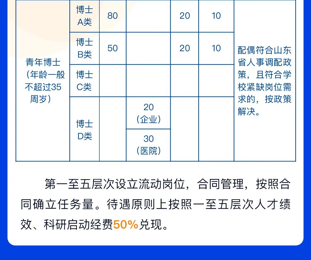 年薪50-150万元,安家费50-100万元;科研启动费实验学科50-150万元、非实验学科30-100万元;配偶安置。
