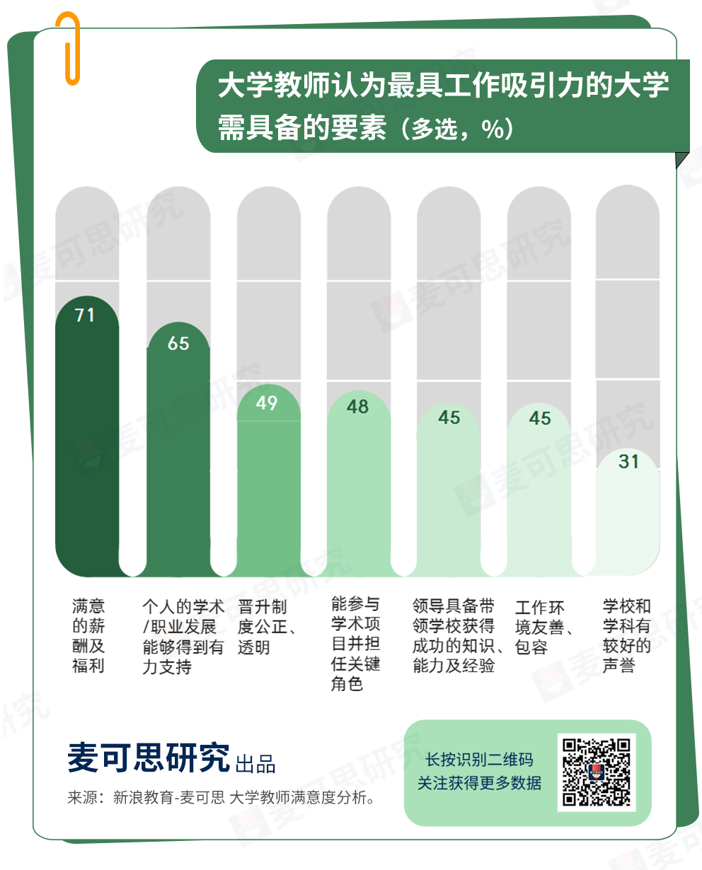 教师眼中,真正具有工作吸引力的高校应具备哪些要素?“新浪-麦可思 大学教师满意度”分析数据显示,受访教师中65%的人认为“个人的学术/职业发展能够得到有力支持”,49%的人认为“晋升制度公正、透明”,48%的人认为“能参与学术项目并担任关键角色”。