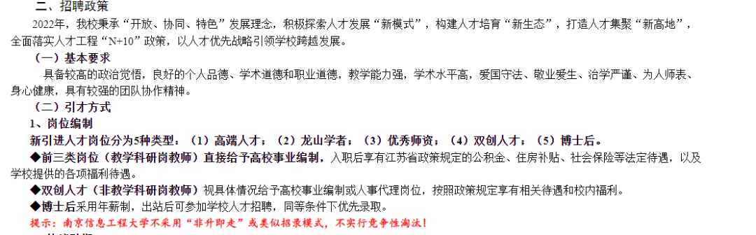 南京信息工程大学去年4月发布的“高层次人才招聘启事(2022年)”中用异于其他内容的字体及颜色特别标注“提示:南京信息工程大学不采用‘非升即走’或类似招录模式,不实行竞争性淘汰!”