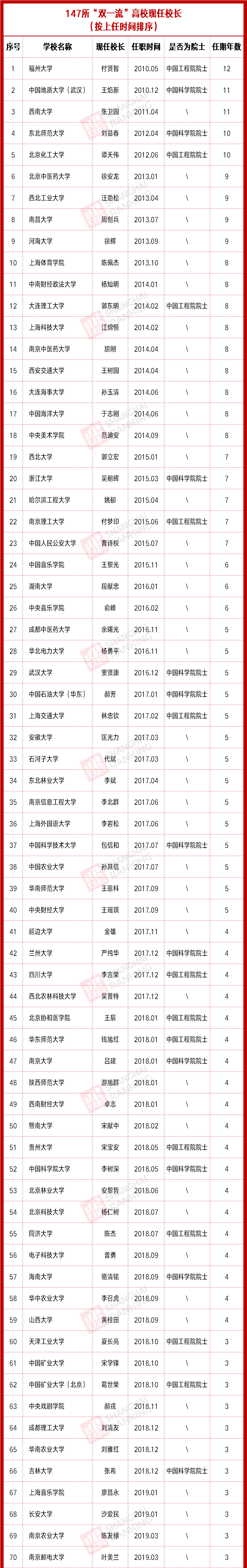 其中任期时间最长的是福州大学校长付贤智,已任职超12年。付贤智1997年从美国回国后,作为“闽江学者特聘教授”引进到福州大学工作,先后担任福州大学化学化工学院教授、博士生导师、光催化研究所所长,2009年当选为中国工程院院士,2010年担任福州大学校长、党委副书记。扎根于福州大学25年间,带领学校攀登科研高峰,创办了我国第一个光催化研究所,成功自主研制出我国第一台光催化空气净化器,实现了光催化技术的产业化,填补了我国光催化技术在应用领域的空白。
