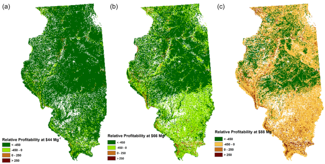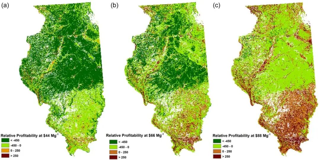 Figure 4:Profitability of switchgrass ($ ha−1) compared to corn at three billion‐ton report prices of (a) $44 Mg−1, (b) $66 Mg−1, and (c)$88 Mg−1
