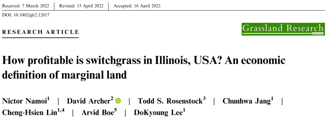 引用格式:Namoi, N., Archer, D., Rosenstock, T. S., Jang, C., Lin, C. H., Boe, A., & Lee, D. (2022). How profitable is switchgrass in Illinois, USA? An economic definition of marginal land. Grassland Research, 1(2), 111- 122.