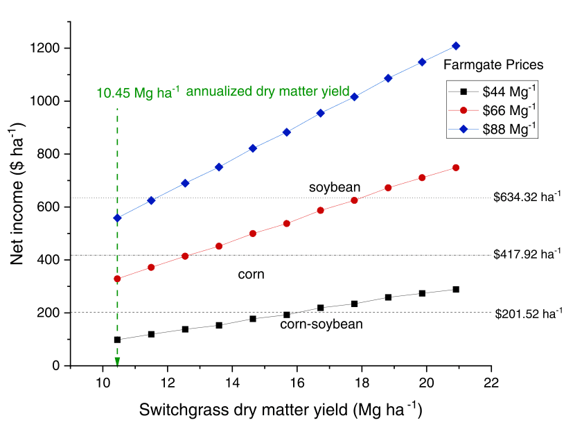 Figure 2:Income from corn, soybean, and a hypothetical corn–soybean rotation compared to switchgrass at various biomass yields using three billion‐ton report farmgate prices ($44 Mg−1, $66 Mg−1, $88 Mg−1). The 10.45 Mg ha−1 line (green) represents the annualized biomass yield calculated from field‐scale data.