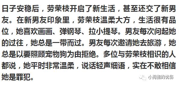 在现男友印象里,劳荣枝穿着很讲究,生活有品位,家里养了两条狗,喜欢弹钢琴,也喜欢去画廊画画,还专门学过小提琴,他表示,至今自己仍然非常想念她。