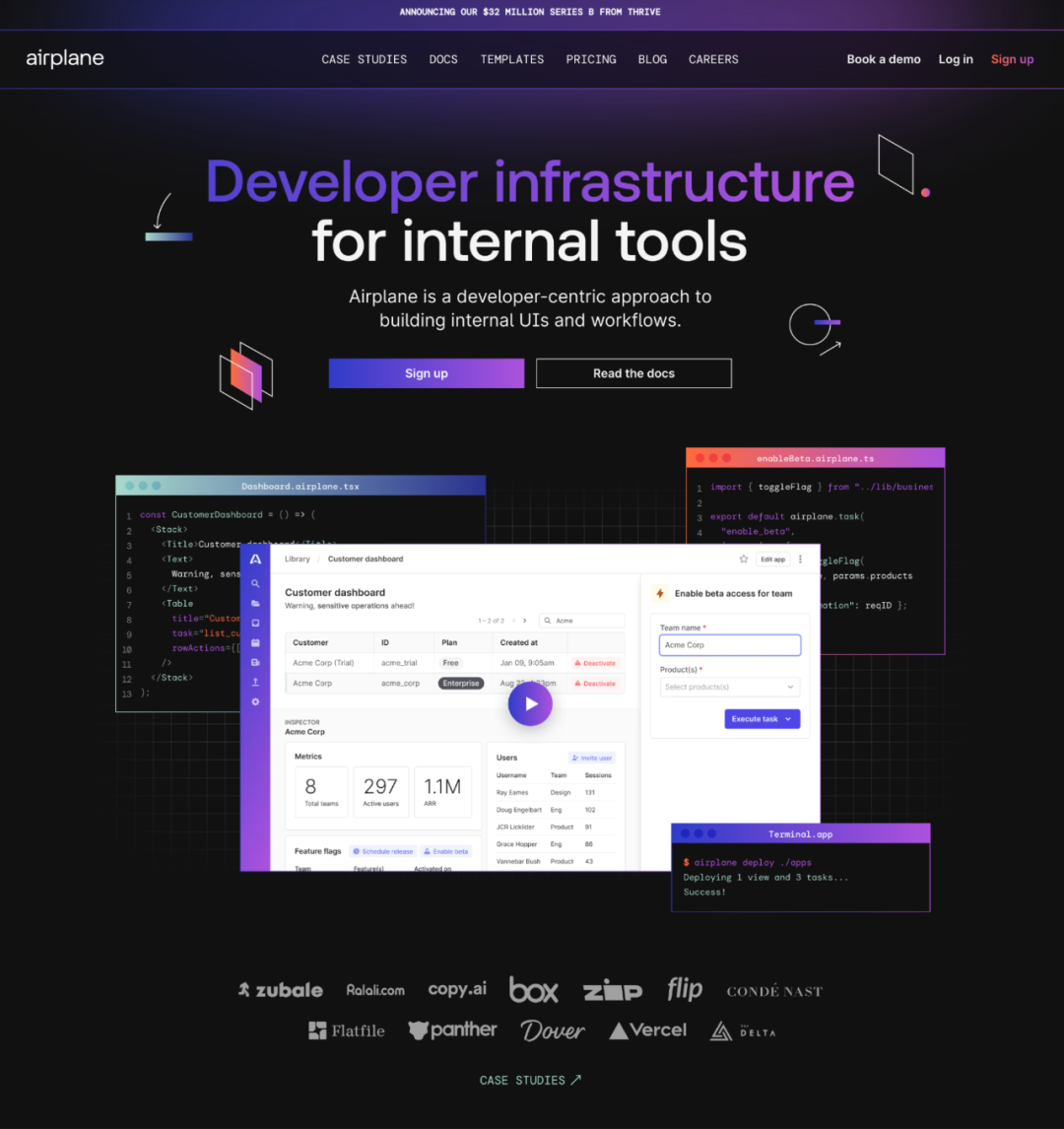 Airplane.dev 成立于 2021 年七月,愿景是通过一系列自动化工具,把公司内部系统和繁琐工作流程自动化。成立不到半年就宣布了由 Benchmark 领投的 850 万美元 A 轮融资(https://www.airplane.dev/blog/series-a-benchmark),今年九月宣布了 3200 万美元的 B 轮。现今已经有 100+ 个付费客户和几千名开发人员。一年半的时间,增长速度惊人。