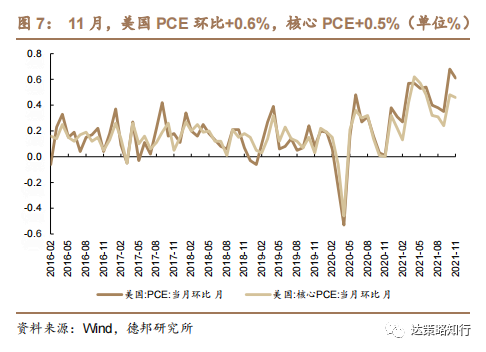 美国核心PCE创近40年来新高,符合市场预期。12月23日,美国商务部数据显示,美国11月PCE物价指数同比上涨5.7%(前值5.1%),持平预期,是1982年6月以来的最高水平,远远超过美联储2%的目标,核心PCE同比上升4.7%(前值4.1%),高于4.5%的预期,为近40年来的最高水平。11 月PCE 环比上涨0.6%(前值0.7%),符合预期,核心PCE环比上涨0.5%(前值0.6%),略高于市场预期值0.4%。