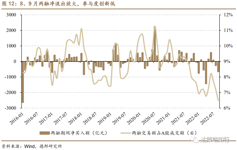 9月单月两融净流出放大至-658亿元,参与度创下杠杆牛市以来新低。两融交易情绪尤其是融资买入情绪连续3个月回落,两融交易额占全A成交额比例由8%以上直线下降至6.48%,相较于4月的6.77%更低,月度参与度创下2015年杠杆牛市后的新低。总量出清力度相较于3、4月分别净流出-552、-1432亿元仍较低,当前杠杆资金尚未出现负反馈。