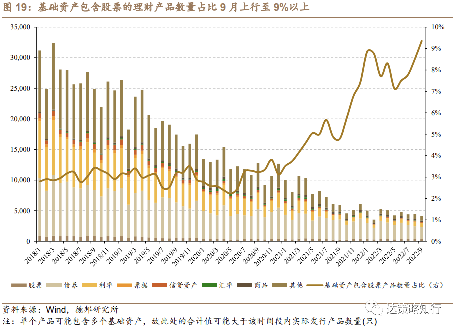 9月理财新发结构权益占比上行至9%以上。今年以来,基础资产包含股票的新发理财产品比例由年初回落至5月的7.13%后,连续4个月上行,结合当前理财资产配置中权益占比较低的背景,未来可投权益的新发产品将有望带动理财整体增配权益相关资产。