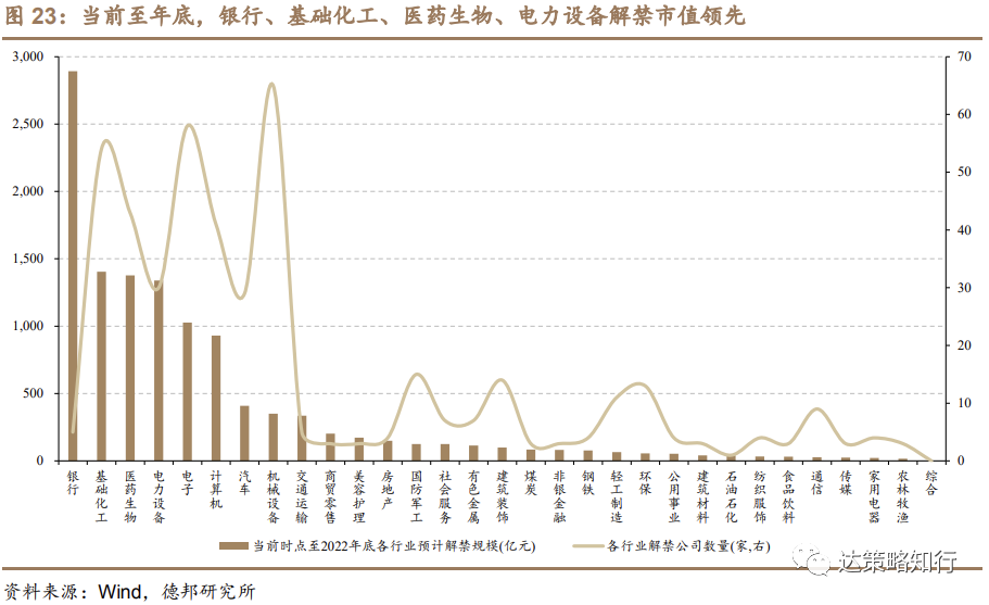 当前10月份解禁压力较小,11、12月解禁压力则不断上行。分行业来看,银行业解禁压力主要为邮储银行年底的大规模解禁,医药生物、基础化工、电力设备解禁市值与公司数量均领先。