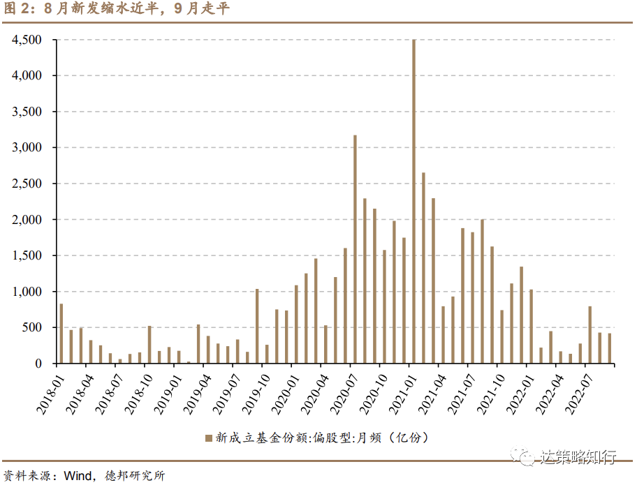 9月新成立公募偏股型基金份额420亿份,相比8月走平,比7月缩水近半。7月份公募偏股型新发在被动型产品贡献主要增量的背景下迎来脉冲后,8、9月份偏股新发环比缩水较多至420亿份并走平,但仍高于4、5、6月水平,整体新发情况表现为下有支撑。