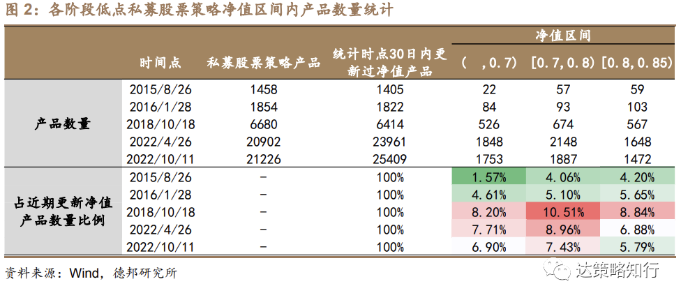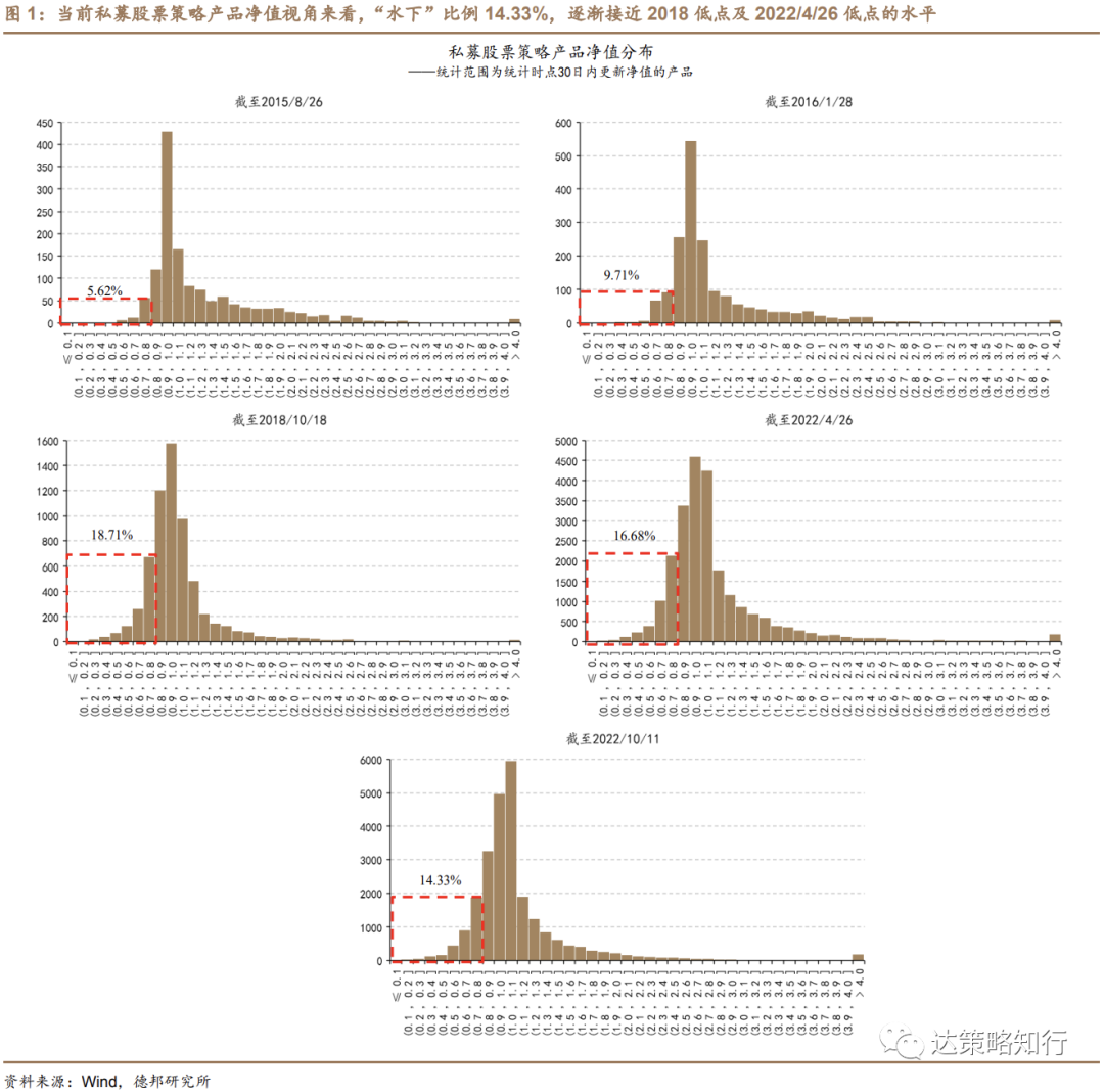 导读:我们统计历史市场低点、前期4/26万得全A指数低点时点、以及截至10/11的数据,对比私募股票策略产品净值分布以及占统计样本的比例,借此监测流动性负反馈程度。