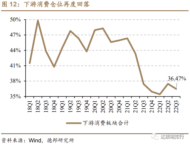 医药配比连续两季度大幅压降,分位已降至20%水平。医药生物22Q3配比降至9.87%(-0.92pcts),连续两季度大幅回落已下探至10%以下,同时历史分位也仅有20%水平,医药行业机构配置水平当前处于较低位置。其余下游消费行业大部分配比均有下行,仅家用电器+0.28pcts、农林牧渔+0.21pcts环比有较显著上行。