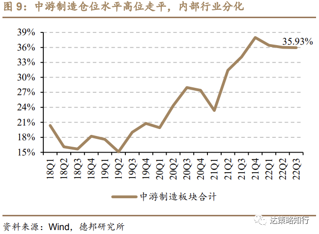 2)中游制造:板块内行业高低收敛,国防军工配比创历史新高;