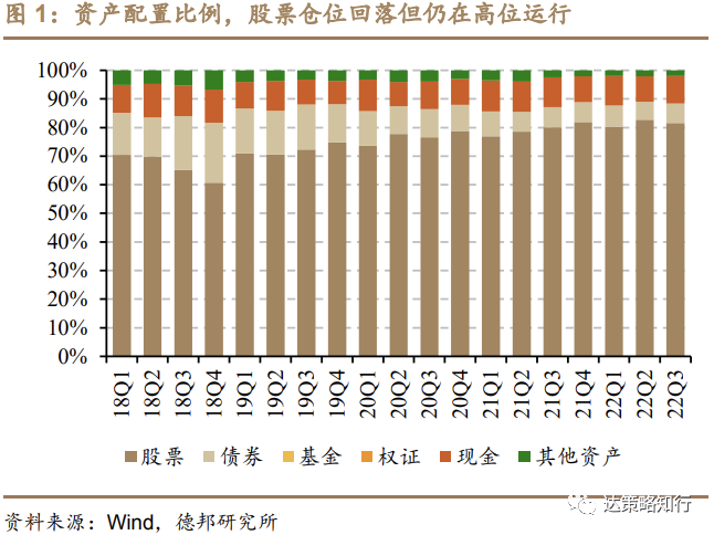 主动偏股基金22Q3股票仓位回落至81.57%,整体仍位于高位运行,22Q1后Q3资产再度全面缩水。22Q3市场再度迎来大幅回调,各类资产均有缩水,但整体缩水幅度不及Q1。其中股票资产约为4万亿,环比变化约为-14%。股票资产仓位占比小幅回落,但仍位于80%以上的高位区间。