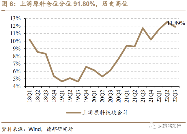 建材、钢铁配比下降,对上游原料板块形成主要拖累,煤炭配比上行显著,整体来到历史70%分位以上,石油石化、化工、有色仓位环比无显著变化。一级行业22Q3仓位降序分别为有色金属5.13%(+0.04pcts)、基础化工3.45%(-0.19pcts)、煤炭1.36%(+0.47pcts)、石油石化1.04%(+0.06pcts)、建筑材料0.60%(-0.57pcts)、钢铁0.31%(-0.45pcts)。